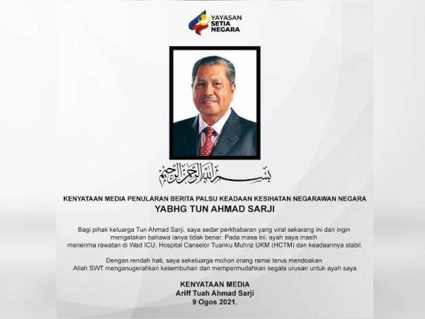 Jtcn3il6frs2lm from www.sinarharian.com.my Anak kepada bekas ketua setiausaha negara tun ahmad sarji abdul hamid menafikan laporan kematian bapanya yang tular di medial sosial. The former chief secretary to the government was admitted to the hospital cancelor tuanku muhriz (ukm) in cheras. Ahmad sarji merupakan ketua setiausaha negara dari tahun 1990 hingga 1996 iaitu ketika era pentadbiran perdana menteri keempat, tun dr. Ahmad sarji bin abdul hamid (born 16 september 1938) is the former 9th chief secretary to the government of malaysia, serving as chief secretary from 1 february 1990 to 16 september 1996. The chief secretary to the. After retiring, he was appointed chairman. Facebook messenger twitter whatsapp email print. The evening saw the arrival of many prominent guests, much to the delight of the couple.